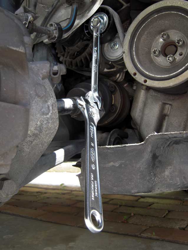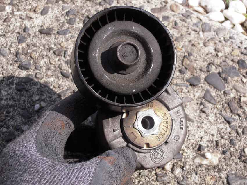 理由はお店に行った時に担当のM口さんがお休みで、当日対応してくれたE籐さんの仕事っぷりがダメダメで話にならなかったからですが、よせばいいのに「この人でも大丈夫だろう」という私の甘い考えが原因で時間を無駄にしてしまったと言うことですわ。 ジュリア乗りの箱男さんからも「お店じゃなくて、やっぱり人ですよ」と深いぃ~格言を頂いたり、色々と勉強になりました。 アレーゼ○松へ修理に出す際は、信頼のおけるスタッフに直接お話することを強くオススメします。 と言うわけで、信頼のおけるスプリントの大石さんに相談すると色々とアドバイスをもらったので、自分で出来る範囲のことはやってみようと現状を確認することにしました。まずはベルトの張り具合をチェックするためカバーを外します。 ベルトを手で押してみるとテンションが緩めで、ロドスタの倍くらいのイメージ。 次に右フロントのタイヤを外しホイールハウスのカバーを外すとクランクプーリーとベルトが見えます。 クランクとオルタネーター(発電機)の間にベルトがかかっているのがテンショナー。 よく見ると目盛りがが付いていたので、センターのボルトを緩めて張り具合を調整できるかと思ったら固定出来ず…。中にスプリングが仕込まれていて一定のテンションをかける仕組みのようです。 試しにベルトを押したり引っ張ったりしてみると、テンショナーがフリーに動きます。へぇ~、こんな機構なんだ。 念のためオルタとエアコンコンプレッサー、パワステポンプの取り付け部を確認してみたけど固定タイプで、調整できそうにない。 こうなると音の原因はベルトが伸びて適正値を超えてしまっている可能性もあるけど、ベルトは新品交換後3年35000kmだし、おそらくテンショナーの寿命かな? とりあえず音の原因がベルトのすべりか確認するため、ジャンボエンチョーで「ベルト鳴き止めスプレー」を買ってきました。 明日始動してみて効果を確認します。 今日は久々に156のオイル交換。前回交換したのは2012年6月で走行距離は83500kmの時。現在の走行距離は93000kmなので、またもや予定より引っ張ってしまいました(汗