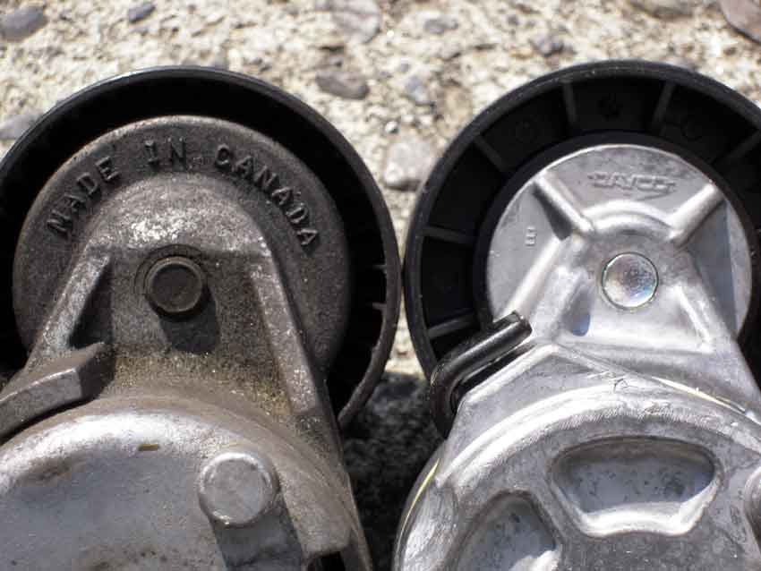 新品のテンショナー。 寸法は同じだけど明らかに別部品ですな(汗 ついでにドライブベルトも交換しました。 ディーラーで発注した正規部品が何とメイド イン インディアですよ!インド製の部品がグローバルに使われる時代になったのですね~。 早速組み付けようと思ったら、テンショナーのテンションが交換前と比べて明らかに重い。手持ちの工具ではどうにもならなかったので、近所のホムセンで15mmのコンビネーションを買ってきました。 ベルト張りに難儀したので、禁断のモンキースパナと合体。念のためソケットも買ってみたけど、場所が狭いのでコンビネーションの方が作業性が良かったです。 ちなみに、新品のベルトは硬くて外れやすいので、プーリーとベルトを養生テープで留めとくとイライラしなくて済みますよ。 あとついでに少し前から気になっていたランプ部分のフードとフェンダーの段差を直しました。 ストッパーがねじ込み式なので、適当な高さに調整します。 イイカンジ。 交換後試走してみたところ、ヒュルヒュル音はバッチリ消えていました。良かった。 ■MEMO 走行距離:96700km フェイスリフト前(ワルター・デ・シルバ顔)の156はフロントのナンバープレートに台座が無く、うっかり洗車機にかけるとほぼ100%めくれてしまいます。