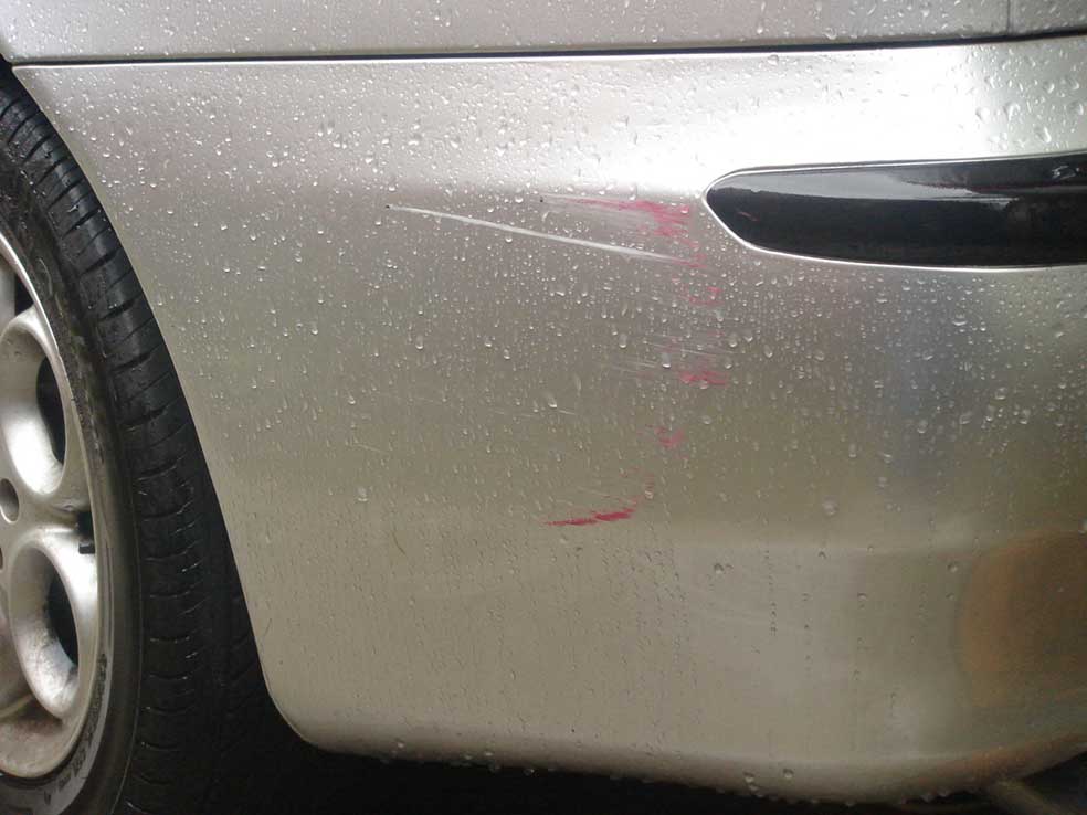 嫁「重大発表です」 なにごとじゃ? 嫁「スーパーの駐車場でアルファのバンパーを壁に擦ってしまった。ショック・・・」 !!! ガーン!ついにやってしまったか・・・。しかし平静を装いつつ・・ おおにし「しゃあないよ。形あるものはいつか壊れるんだから」と心はガクガクブルブルしながら返信w 実車を見てみると・・・バックで赤い物に当てて、気づかず動いたのがわかります。 自分の見積もりだと直接板金塗装屋さんに持ち込んで3万円てとこかな? 早速近所のカーコンビニ倶楽部に行って見積もりを取ろうとしたら、「あ~、外車は塗料が無いから作業できないんだよ。ごめんね」と断られました。 次はスーパーオートバックスで板金塗装の見積もりをお願いすると、「バンパーを外さずマスキングでバンパーの半分を塗装して補修できます。料金は12500円です」との回答。意外と安いのね。 156は今週末に3回目の車検+タイベル周り一式交換でディーラー入りするので、その時に板金修理の見積もりをお願いしてみます。 久しぶりのアルファネタ。