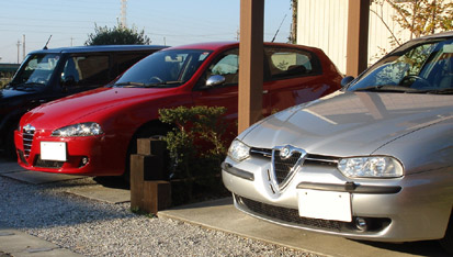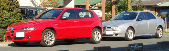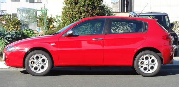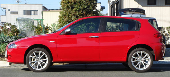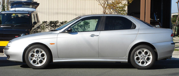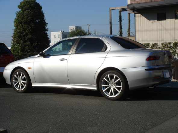 ロードスター以外の車歴その4です。2台目(1台目は2.5L V6 6MT)の156ですが今回のは02年式2リッター4気筒のツインスパーク 5MTです。一応我が家のファミリーカー(笑 28と棲み分けをするために、快適性と経済性を重視してます。 ■タイヤ 購入時にヒビ割れていた賞味期限切れの純正タイヤから、ブリヂストンのレグノ(GR-8000)にしました。今までの自分の車の使い方が走り一辺倒で、Sタイヤやハイグリップラジアルばかり履いていたので、人生で初のコンフォートタイヤです。 レグノ自体は友人から「高いけど一度使うと病み付きになるらしい」と聞いていましたが、着けてみてびっくり!とても静かで乗り心地が良く、段差を乗り越えてもしなやか。しかもコーナーで腰砕けにならず、ちゃんとグリップします。凄い高次元で全てがバランスされたタイヤで、高いのも頷けます。 ■ETC 憧れのETCを初めて付けました。これでパワーウィンドーが壊れても怖くない(爆 ■燃費 思ったより低速トルクがあってエンジンをそれほど回さず走れるので、年間通して平均10km / Lは走ります。高速使うと12km / Lぐらい。思ったより燃費が良くて家計に優しいですw ただし、夏のエアコン使用時と渋滞にハマると、少し伸び悩みます。 ■インプレッション 車重は1300kgでV6に比べて60kg軽い分、車全体の身のこなしが軽いです。重量バランスもフロントヘビーが解消されて、明らかに鼻先が軽い。 パワー155ps、トルク19.1kg-mも必要十分。156のツインスパークは02年でJTSに切り替わっているので、おそらく最終型だと思います。また、00年式のV6はリヤシートのヘッドレストが2人分でしたが、02年式のTSは3人分あったりと細かい装備が違っています。 ただし、ブレーキはV6と同じで初期が効き過ぎでコントロールが難しく、足回りもドタドタしててイマイチです。アーム類の支持部の剛性が低いのかな?とても怖くてこの車で速く走る気になりません。特にコーナーリング中のギャップなどの外的な入力に弱いと思います。 あくまでファミリーカーなので普通に使う分にはスタイルヨシ!雰囲気ヨシ!マイナー度ヨシ!(笑)と気に入ってます。 ■トラブル 皆さんお待ち兼ねのトラブル集ですが、残念?なことに今まで大きなトラブルはありません。 期待はずれでスイマセン(汗 納車直後にブレーキが振動する症状(ジャダー)が出たのでディーラーに話をすると、パッド代を出してくれればと新品ディスクと交換しますということで、直してもらいました。どちらも消耗品なので一式交換でリフレッシュできて良かったです。 あとは10月にバッテリー上がりを起こしたけど交換時期だったし、半年に一度行うオイル交換は通常のメンテナンスの範囲ですしね。 強いてあげるなら、炎天下のエアコン使用時にアイドリングが定期的に波打って、発信時にエンストしやすくなることでしょうか。これはV6でも出ていた症状なので、156の持病と思って諦めています。 今のところ自走できなくなる程のトラブルは無く、とてもイタ車とは思えません。正直国産車と同じぐらいの安心感があります。V6の時とはえらい違いですが、ひょっとしたら慣れですかね(笑 ■これから もうすぐ5年目の車検なので、何かネタがあったらUPしようと思います(笑 所有期間:02年12月~03年12月 ■ファーストインプレッション お店で受け取り、帰りの東名で感じた第一印象は「何てジェントルな雰囲気なんだ!」(ロードスター&ワゴンR比)でした。ロードノイズや風切音は少なく(ロードスター&ワゴンR比w)V型6気筒エンジンサウンドが程よく入ってきます。また、100キロで走っていてもストレス無く流れに乗ることができ、追い越しが楽で気に入りました。 ■車いじり 購入するきっかけになった甲高いアルファサウンドを手に入れるべくネットでマフラーの情報を調べると、ユニコルセかメックスが良いということで、オークションで中古のユニコルセマフラーを落札しスプリントで取り付けました。 しかし音はバリバリと低音で室内の篭り音がボヮヮヮヮヮンとひどく、エンジンを止めても耳鳴りがするほどです。族○みてぇ・・・。これでは乗ってられないし捕まってしまうので、すぐにお店に引き返しノーマルに戻しました。装着時間30分と過去最短パーツです(泣 情報ではノーマルで不等長のフロントパイプを等長タイプに交換することで排気干渉が無くなり本来の音色を奏でることができるとあるので、中古のフロントパイプをオークションで探しますがナカナカ見つからず、アーキュレーの新品を買いました。 今度はフロントパイプとマフラーの同時取り付けを行ったところ、以前の篭り音がウソのように澄んだ排気音に変わりました。空ぶかしするとクァンクァンと鳴くような音色でとてもV6とは思えません。これぞ求めていたアルファサウンドです!トンネルや壁のあるところを走っては、無駄にシフトダウンを繰り返してましたw 156マフラーサウンドサンプル集はコチラ ただしアイドリングの音量はち