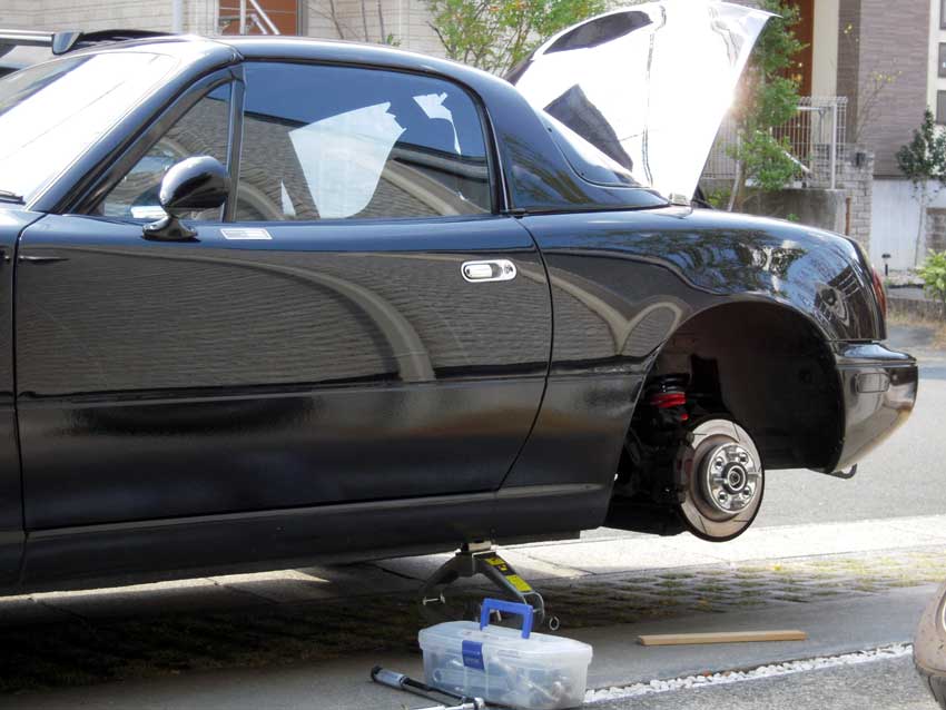 その時は大したことないかなーと思っていたら、自宅の駐車場に直径7mm程のオイルの染みがあったので、うえしまセンセイに部品の手配をお願いして、交換してきました。 交換前。 新品のシール。 交換後。 コレで安心して踏めます! その後、先日の白糸でフルブレーキング時に、何となく左前の効きが強くて不安定な挙動が出ていたので、ブレーキのメンテ。 実はうえしまセンセイとコップ君のクルマを試乗した後に、自分の28に乗り換えたら「このクルマのブレーキオカシイ!」と気が付きました。慣れって怖い(笑)。 右前 左前 うえしまセンセイによると、左前外側のパッドが偏磨耗している=スライドピンが固着気味だそうです。 一度パーツクリーナーで綺麗にしてからグリスアップをしてもらいました。 仕上げはヌッキーⅡでブレーキ&クラッチフルードのエア抜き。 不安要素があるとクルマとの距離が出来てしまいますかからねー。メンテって大事。うえしまセンセイありがとうございましたー。 ピロのガタが出ていたアラゴスタのアッパーマウント。何とかしてコレを使いたいので、スプリントの大石さんにお願いして修理してもらいました。