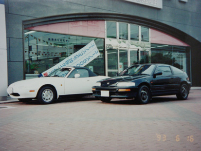 高校生の頃、ホンダという会社とライトウェイトスポーツのサイバースポーツCR-Xに憧れていて、学生の頃乗ってたバイクもホンダばかりで完全にホンダ党でした。 学生の頃はとても車を持てなかったので、社会人になってから憧れのCR-Xを中古車で買いました。 学生の頃バイト先の先輩がハチロクでジムカーナをしていたので、モロに影響を受けて自分もモータースポーツデビュー。 浅間台や茨城中央、筑波のジムカーナコースまで遠征したり、会社の先輩に誘われて瑞浪モーターランドや愛知県にある河川敷のジムカーナコースにも行ったっけ。 V-TECエンジンは速くて楽しかったですが、最後は前オーナーが起こした事故後の修理が中途半端で、一般道走行中に片側のエンジンマウントを止めるボルトが折れて、エンジンがサブフレームに落ちました。 修理は無事にできたのですが、中古車に対する不信感が払拭できなくて、次の車を物色し始めることに。 その頃走り好きの友人がユーノスロードスターを買うと本やビデオを買い揃えて盛り上がっていましたが、自分のロードスターに対する第一印象はナンパなイメージだったので、あまり興味がありませんでした。 しかし友人の盛り上がりに影響されて徐々に興味を持つようになり、ディーラーで試乗したら遅いけどヒラヒラ曲がって、楽しくて気持ち良いぃぃぃっ!ライトウェイトスポーツと言う同じ種類の車ですが、CR-Xとは全く違う方向性の楽しさに大きな衝撃を受けたのです。 ホンダ党だったはずが、あっという間にユーノスロードスター党に変わってしまい、数ヵ月後にはディーラー前で納車の記念写真を撮ってました。 ・・・続く
