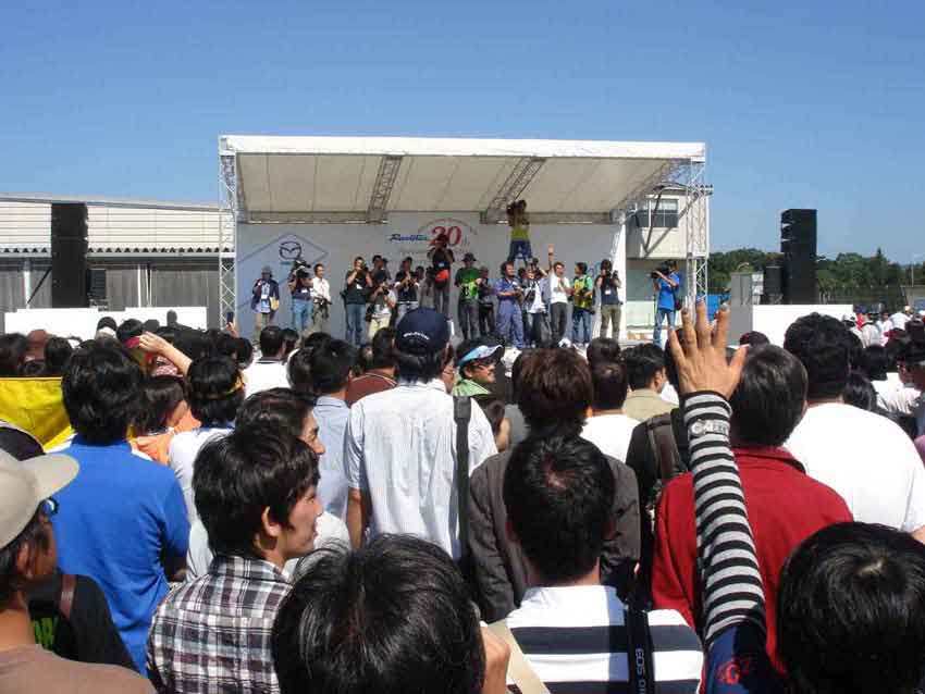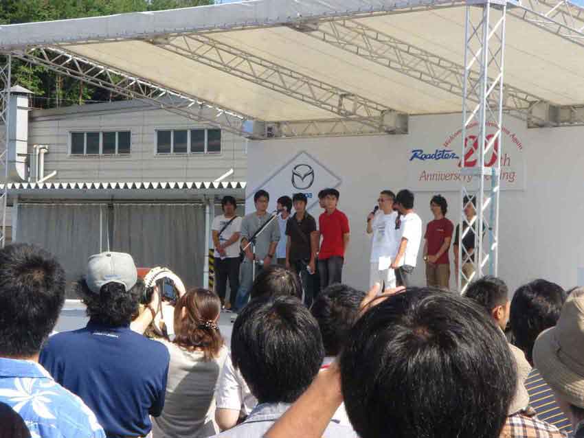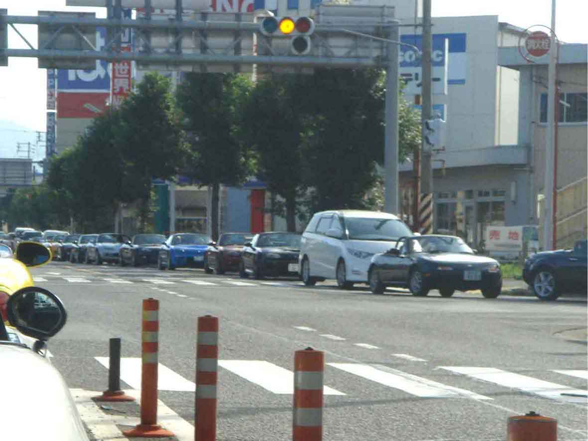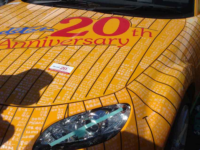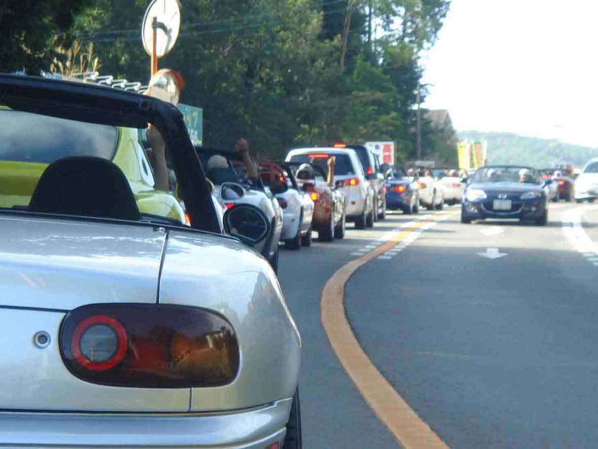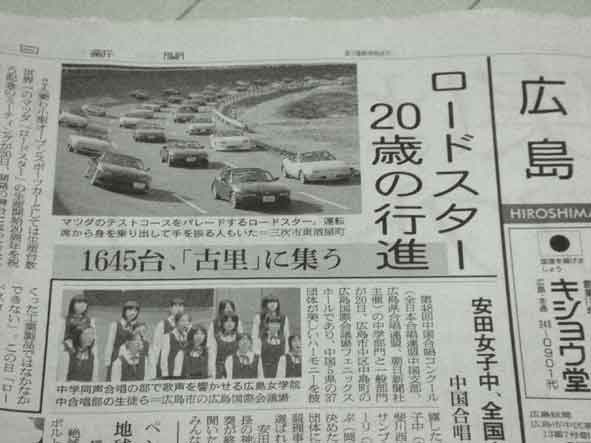 パレードも2周目に入ると一列目が退場していきます。 スタッフの方々が「行ってらっしゃ~い!」と笑顔で声をかけてくれるので、こちらも笑顔で「ありがとうございま~す!行ってきます!」と手を振って挨拶。 この時点で4列目の方々はまだパレード待機中で手を振って見送ってくれています。2時間ぐらい待たれていたそうで、有難うございました。 17:15 退場 2列目もメイン会場のあるストレートの切れ目から順次退場して行きます。 多くのスタッフの方々と笑顔で挨拶してお別れ。この渋滞もしばらく見納めですね。 このあと近くのコンビニで休憩して、はこしゅうメンバーは広島で宿泊するということでここでお別れ。 18:00 ホテルチェックイン 自分は三次のビジネスホテルに泊まるので、三次駅方面に向かいますが、多くのミーティング参加者は反対方面の三次ICから帰るようで、すれ違うロードスターにここでも「ばいばーい」と手を振って挨拶。 ホテルに到着しチェックインを済ますと、近所のスーパーで独り打ち上げの買出しをして、晩御飯はホテル横のラーメン屋で済ませました。 19:00 早寝 お風呂上ってビールと酎ハイ飲んだら、寝不足と疲労で直ぐに撃沈w 【21日 月曜日】 8:45 チェックアウト 世間はSWで大型連休ですが、ウチの会社の休日は今日でオシマイ。なので、何としても今日中に帰らないといけません。 SW中の高速の渋滞は避けられないので、早めに行動開始。計画では夕方浜松に着弾予定。 高速へ乗る前にGSへ寄ってハイオク満タン。スタンドのおじさんに「浜松から来たの?遠くて大変だね~」と話しかけられて、ちょっと嬉しかったり。 9:10 三次IC ICに向かう途中で数台のロードスターと遭遇しましたが、手を振って挨拶してくれます。まだ祭りは終わってませんね。 いざ東へ! 中国道を走っていると時々ロードスターを見かけて、室蘭(!)ナンパーのワインレッドのNCがいたり、沼津ナンバーの赤ソリッドのNC、多摩ナンバーのブルメタのNA、相模ナンバーのフルノーマルなダークブルーの1028などミーティング参加者とプチツーリング。 吹田JCT付近と京滋BPの途中から渋滞。合流と分岐が続く区間なので仕方がないですね。 14:00 土山SA 12時前後はどうせ混んでるし、遅目のお昼にしようと思って入った土山SAが激混み!フードコートは空席が無く、たこ焼き屋は行列、コンビの弁当は売り切れ。 土山SAは上下線で共用してるので、休日の昼~夜は完全にキャパがオーバーしてて使えませんね。 仕方がないので、そのまま移動。 東名阪の亀山JCTから四日市ぐらいまで渋滞。四日市JCTまで45分ぐらい。伊勢湾岸道はスムーズで、途中フェラーリF430に抜かれてイイ音にやられました。やっぱりスーパーカーっていいなぁ。 豊田JCTから岡崎まで渋滞して、あとは割りとスムーズでした。 16:45 浜松到着 浜松西IC近くのGSで給油すると、38リッターでした。三次から525kmぐらいなので、平均燃費は13.8km/L。思ったより伸びなかったですが、渋滞のせいかも。 残りは10Lだったので、浜松~三次間は無給油で行けそうですね。 【オマケ】 朝ホテルで新聞を見ると20周年ミーティングの事が記事になってたので、記念にコンビニで買おうと思ったら朝日新聞が一部だけ売ってたので買ってみると、広島の地域版のページに白黒で記事になってました。 大事に取っておきます。 自分へのお土産に20周年記念ワインを会場で販売してたので買いました。これは開けられませんね。 ロードスター尽くしの2日半でしたが、最高に楽しかったです!三次に行って何か物凄いパワーをもらって来ました。やっぱりロードスターとロードスター乗りにとって三次は聖地なんですね。 悔やまれるのはずっとメイン会場にいて、参加者皆さんの車をほとんど見れてないこと。じっくり見たかったなぁ・・・。 ロードスターを愛する皆様、素敵なイベントを有難うございました!最高に楽しませてもらいました。 およそ3650日後の2019年9月の30周年ミーティングも、28で参加できたら最高ですね! 渋滞にハマりつつ会場に着くと、マツダのスタッフの方々が「お帰りなさ~い!」と笑顔で迎えてくれて、里帰りの実感がこみ上げて来ました。