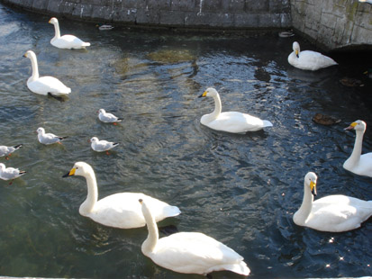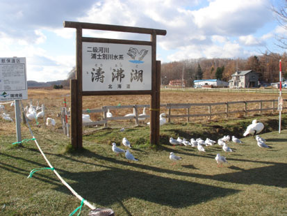 公園に着くと白鳥が越冬に来ていて岸に集まっています。子供をおんぶして餌をあげたりして遊びますが、外にいられるのは寒くて10分が限界…。