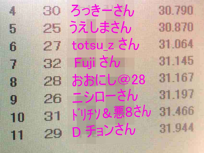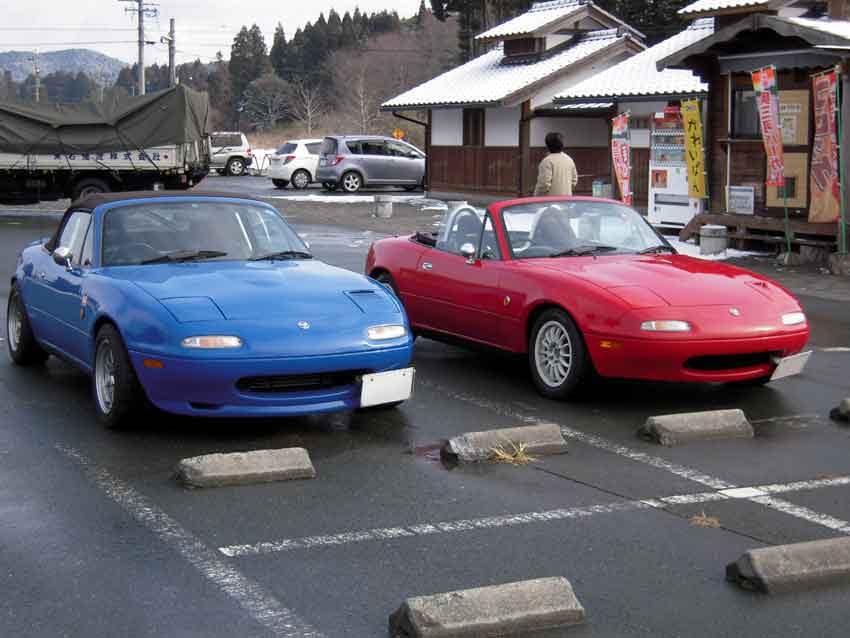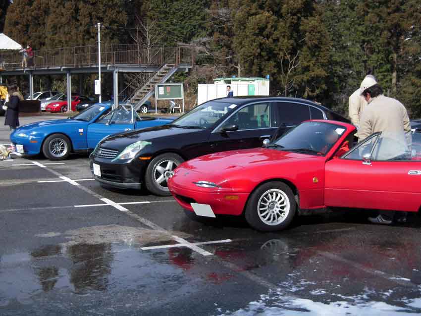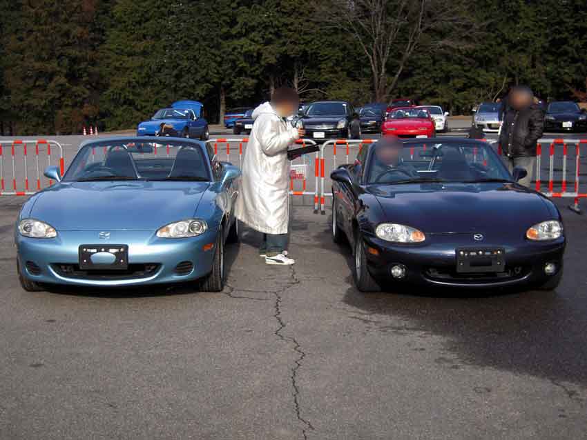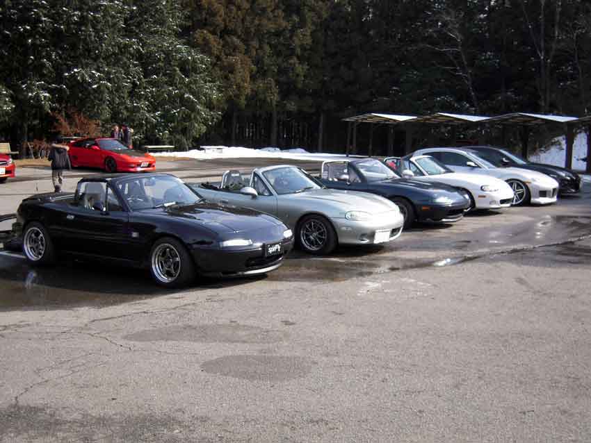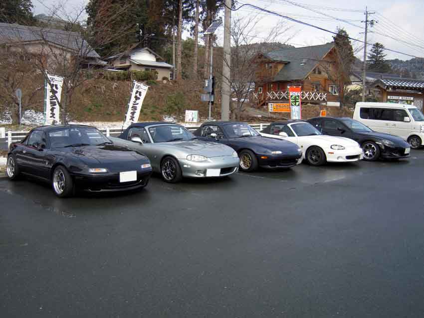 11時に道の駅「つくで手作り村」集合だったけど10時半過ぎに着いてしまい、まだ誰も居ないよなぁ~と思ったら見たことある車がいっぱい居ましたw 左からおおにし@28、ニシローさん、ろっきーさん、totsu_zさん、Fujiさん。ちなみに路面は夜に降った雪が溶けてウェット状態。 「キグウデスネ!」とお決まりの挨拶していると、うえしまセンセイ、さぼてん.さん、コップさんが到着。 コップさんは気温3度の中オープンで登場。若いってイイネ! ニシローさんからは「はしゅうGP」のDVDを頂きました。ありがたや~。 まず手始めに腹ごしらえ。牛串とミックス串。牛串旨し!生Fは帰りに食べるのであえてスルー。 続いて寄せ豆腐をアタック。やっぱ旨いなコレ。 豆腐を食べ終わったころにDチョンさんがV35スカイラインで到着~。神奈川からようこそ。 お腹が満たされたのでモーターランド三河(以下MLM)へ移動ー。MLMは今まで行く機会がナカナカ無かったので今回が初走行。 コップさんは今回がサーキットデビュー。うえしまセンセイからサーキット走行のイロハを教えてもらってました。 走行は13時枠。天気は晴れ時々曇り。コース自体は雪の影響で1コーナー周辺がセミウェット。その他はほぼドライ。 初のコースだし、最初は5割ぐらいのペースで行きますかー。ちなみにスペMの減衰は白糸と同じにセット。 MLMの第一印象はミニサーキットにしてはスピードが出ますね。自分の28だとストレートで4速入りますし。同じミニサーキットでも白糸は2速メインのコースジムカーナ、ALTはアップダウンが面白い峠みたいなコースかな。 最初はタイヤが全然食わなくて、あちこちでアンダー&オーバー祭り。この時期だと5周位はウォームアップしたほうが良いみたい。 徐々にコースにも慣れてタイヤもグリップするようになり、すっかり攻略モード。コーナーの侵入パターンをいくつか試したり、常連さんの走りを後ろから見て、ライン取りを盗んだりw イイカンジに乗れて来たなーと思ったら機械式LSDが不調になり、最終コーナー立ち上がりの途中で突然ロックしてドリフト状態に・・・。ラインをワイドにすれば良いけど、タイムロスするしなー。要修理ですな。 と言うわけで、結果はコチラ。 一部ハーフウェットのMLM初走行で28秒台に入りました! コースも面白かったし結果も出たのでサイコーですね♪ 15時枠はもうひとつのイベント「レンタルカーのロードスターで腕自慢大会」。 車両の詳細はニシローさんやうえしまさんのとこにアップされているのでそちらをご確認ください(丸投げw 事前チェックによると、水色のNBはABS付き、紺のNBはABS無し。参加者は8名なので4人ずつ2チームに分かれての走行となるので、車両選択と走行順がカギ。 自分の希望はABS無しの紺色NB.。 「紺色希望のヒト集合ーッ!」と集まると6人。2名多いのでジャンケン勝負! 「最初はグー、ジャンケンポイ!」 負けました(泣 ABS付きの水色NBチームで集まり、走行順を決めるジャンケン。 勝った人から走行順を選びます。自分の希望は3番目。車が温まっていない1番目はなんとしても回避したいところ。 「最初はグー、ジャンケンポイ!」 また負けました(号泣 と言うわけで、ABS付きのNBで一番最初に走行という、希望と真逆の結果にw 車両自体は癖もなく至って普通。エンジンが遅いけど、ほぼ素のNB6って面白いね~。 で、結果は ろっきーさんとうえしまセンセイ速すぎ。自分は5位とビミョーな結果。トラクション重視を狙ってスペアタイヤを降ろさなかったのが敗因かな~と言い訳w ◆おまけ 今日一番楽しんだヒトの画像(一部画像処理済み)。