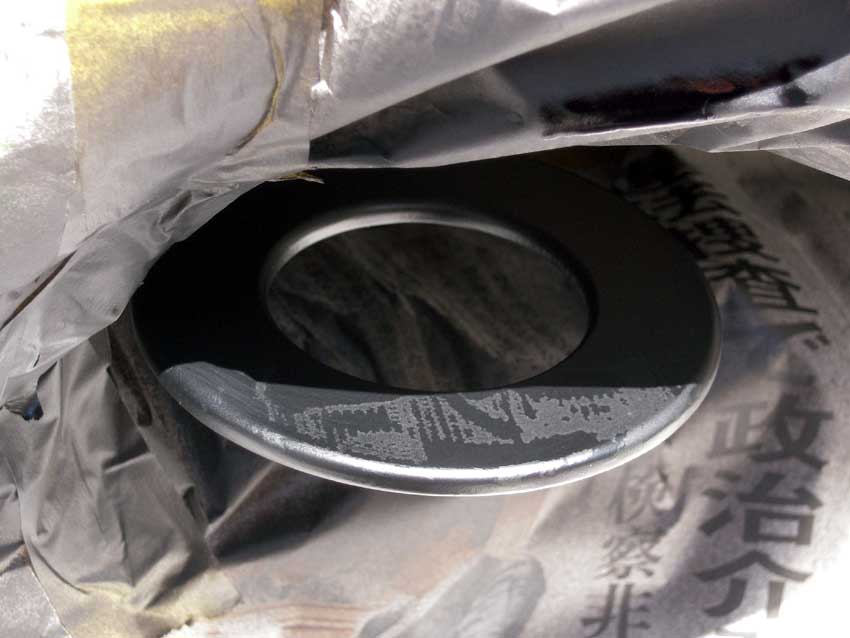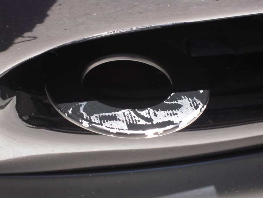 先日のはこしゅうGPで、タイム計測器をフロントのトーイングフックにタイラップで取り付ける際に傷が付かないよう養生テープを張ったところ、テープを剥がす際に塗装がはがれてしまいました・・・。