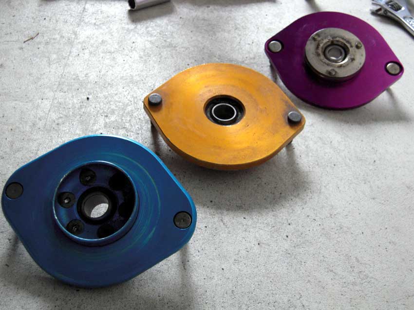 左からクスコ(レンタル品)、アラゴスタ、HKS。カラフルだねぇ。 HKSアッパーはプレートが薄く6mmしかありません。ちなみにクスコ10mm、アラゴスタ8mm。 ピロの内径はクスコとアラゴスタが18mmでHKSが14mmとサイズが違うので、ピロナットの共用はできません。 早速取り付けてみたところ異音は収まりましたが、ピロの設定位置がイマイチでセット長が変わってしまい、プリが抜ける方向になってしまいました。 つまり元のプリ感を求めると車高が上がる結果に・・・。 個人的にはアシの動きを良くしたいので、極端なハイアッパー化は避けたいところ。シャコタンかつアシの性能を引き出したいので、色々悩んでみようと思います。 PR
