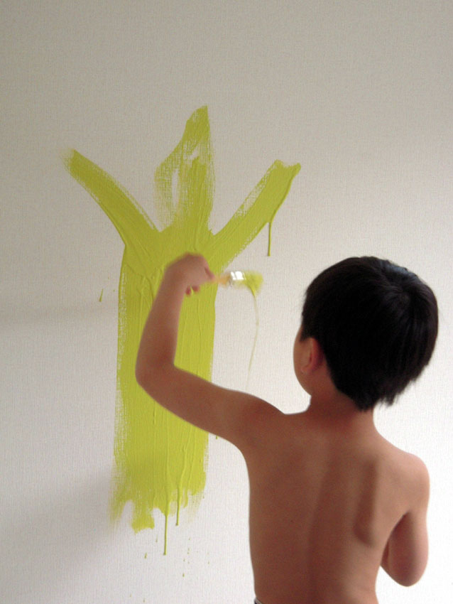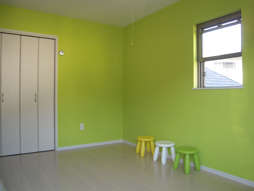 とりあえず机と棚を移動して作業しやすい環境に。 お約束の落書きタイム。今日は最高気温が25℃ぐらいあって暑かったので上半身裸で。 塗料は前回と同じく壁紙屋本舗で、色は長男が選んだ「グリーンアップルの香り」にしました。 全面白い壁の時よりも明るくなって広く見えますね。 子供部屋らしくなってイイカンジです。 PR