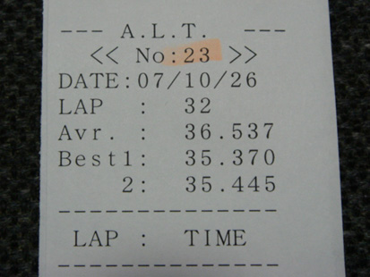 しかし当日の作手の天気は朝から雨・・・。仕方がないのでタイヤはそのままで走ることに。 前回走ったのはコース改修前のショートコースだったので、以前と比べるとコースが広く長くなって攻め甲斐がありそうです。 平日なので9時からの走行枠は仲間だけの貸切状態でマイペースで走れて良かったんですが、どうにも走り方がしっくり来ない。雨+Sタイヤのハードコンパウンドということもあって本来のグリップを発揮しないので、様子見で3速(注:NB6MT+4.1ファイナル)固定で走ってみたら35秒後半というタイム。Oさんは34秒台というタイムで安定しています。悔しい・・・。 10時枠は休憩してほかの人の走りを参考にすることに。すると新型シビックタイプRが2周目に34秒台、3周目に33秒台を叩き出して二人とも瞬殺されました・・・orz タイプR速え~! 雨は徐々に止んできて空も明るくなっています。このまま待てば路面が乾くと思い11時枠もパスして12時からの走行に賭けます。2時間雨が降らなければ路面状況も改善するでしょう! 走行準備を済ませてコースに入ったらポツポツと雨が。空を見上げると灰色の雲が立ち込めています。Oさんと本格的に降る前にアタックしようと慌ててコースに出るもあっという間に本降りに・・・と言うか土砂降りなんですが・・・(焦) それでも走り続けていたら前を走るOさんのインプが1コーナーでアウトにはらんで行きます。譲ってくれたのね~と前に出て、次の周の1コーナーでブレーキを踏むと・・・と、止まらない・・・(汗) ??? 何が起こったのかわからず、ステアリングを切っても・・・ ま、曲がらない・・・(滝汗) !?! その後直感したのは、もしかしてハイドロが起こってるのかぁ? !!! ぬぅををを~!とパニックになりながらも人間ABSで徐々に減速して、ちょっとダートに落ちながらもクラッシュは回避できました。正直やっちまったと思ったよ・・・(-_-; ピットに戻ってOさんと話すとOさんも前の周にハイドロが起こって制御不能になっていたそうです。譲ってくれたわけじゃなかったのね(恥) 雨は小降りになってきたのでアタック再開です。徐々に走り方がわかってきましたが、どうにもギヤの選択に迷います。結局悩みながら走ってベストラップは35秒370と不甲斐ないタイムでした。 今回はタイヤ選択に始まって天気の読み、走行枠と全てが裏目に出てしまいました。「攻め」と「無謀」を履き違えてはいけませんね。反省。 今度「はこしゅうGP」でご一緒しているNB8C乗りで作手経験者のほ~り~さんに色々聞いてみよう。 天候:雨(一時土砂降り) ベストラップ:35秒370 備考:タイヤ DL03G H1 PR