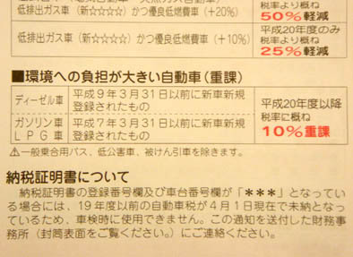 今日今年度分の自動車税支払い通知が来ました。 1.5L以上~2.0L以下の納税額は39500円なので、1.8Lの28もこの金額です。 今年も出費がかさむ時期が来たなぁと思って、通知書を良く見ると43400円!!! 3900円も高い!! いつの間に税金上ったの?? こないだのガソリン税の暫定税率復活に便乗して、税金も上ったとか??? それとも自分の知らない間に2.1Lに排気量アップしたエンジン載っけて、ご丁寧にマル改申請したとかか??? イヤイヤ、正直2.1Lエンジンは嬉しいけど、税金アップはいらんぞ! 冷静になって同封されてる冊子を見るとこんな記述が。 【要約】 平成7年(1995年)3月31日以前に新車登録された車は、排ガスが汚いので、自動車税を1割上げます。 ・・・ 確か28の初年度登録は平成6年(1994年)。 ただ大事に乗ってただけなのに・・・、まだ14年目なのに・・・、世間一般の解釈ではもう「高排出ガス車☆☆☆」扱いなんですね~(悲)。 心情的には長持ちさせたら減税して欲しいと思いますが、国はこうして消費者に買い換えるきっかけを促しているのかもしれません。 詳しくは自動車税infoをご覧下さい。 何となく旧車乗りの実感が増しました。 PR