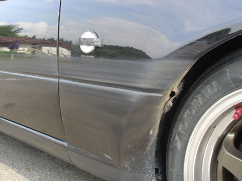 今回は午前中に家の用事があったため、後輩とダブルエントリーすることに。何とか昼休みに着いたので、午後からの走行に間に合いました。 今回は会社の友人達が多く参加して、全部で6人+ギャラリー2人と賑やかでした。 初エントリーは入社二年目の後輩君。スイフト(オレンジ)の1.5Lのオートマがベースなのに、足回りとレカロシートとマフラーなどをイジってて結構シブイ。 昨日付けたリヤ16インチを横から見てみます。白いホイールということもあって、デカいですね~。 後ろから。 う~ん、ナカナカ男前な後ろ姿になりましたよ(笑ちょっとタイヤが見えすぎてて、空力パーツが欲しくなりますね。付けませんけど(爆 今回の課題はフロントA048(S)の205/50R15とリヤA050(S)の225/45R16の組み合わせで、ベストなバランスを見つけること。 ちなみに前回からの変更点はリヤタイヤのみで、セッティングは前回のままで走ってみます。 走り始めるとターンインの向き変えに時間がかかり、フロントがイメージしたラインよりも大回りします。イメージしたラインで走ろうとするとステアリングの量が増えているので、明らかにロスしてます。 逆に立ち上がりではトラクションがかかり、良く踏ん張り前に進みます。 結論としては「リヤタイヤが太くなった事でアンダー傾向になった」ということで、タイヤの外径が大きくなって姿勢が前傾になった事よりも、タイヤ幅が広くなった事の方が勝ったみたいです。 その後はリヤの車高を4mm上げてみたら進入は良くなりましたが、今度は中盤~立ち上がりでオーバー目になったので、2mm下げて走ってみると、結構イメージ通り曲がれるようになりました!それでもリヤのトラクションは強烈なので結構良いかも! 225/45R16はロードスターにはオーバースペックかな?と思いましたが、リヤの安定性&安心感が増して攻め易い車になったと思います。色々試してみないとわかりませんね~。 ちなみにタイムは梅雨時期なのに快晴で気温も高かったので、40秒944とベストの0.9秒落ち。11月の寒い時期には夢の40秒斬りできるかな? ■今日のorz■ 最終枠でほ~り~さんを乗せて走っていたら、最終コーナー立ち上りのラインがはらんで、直線のスポンジバリアに接触しました・・・orz わかりますか? ではアップで。 粗目の紙やすりで削ったみたいに艶消しになってしまいました・・・。 リヤまでキッチリ。 リヤホイールにも当たってたみたいで、茶色い粉まみれになってました。 コンパウンドで落ちるかな? ■今日のorz その2■ 帰り支度をして閉会式も終わって車に戻ったら、車内を40匹ぐらいのアリに占領されてました・・・。 逃げ回るアリ。速すぎてブレブレw どうやら外したハードトップを草の上に置いといたらアリが敵と思って攻撃してて、知らずにそのまま装着してしまったらしい・・・orz このまま運転してアリの攻撃を受けて事故でもしたらたまらんので、コンプレッサーのエアーで吹き飛ばしました。結局全部は無理だったけど・・・。 しばらく車内にアリの巣コロリ置いとくかな? 参加された皆様お疲れ様でした!次回も宜しくお願いしま~す! 仕事終わって、明日のはこしゅうGPの準備。