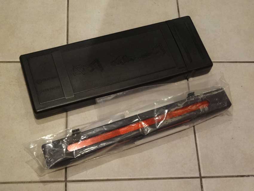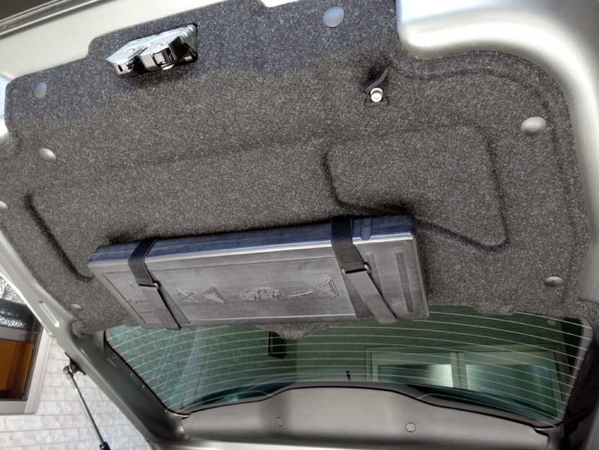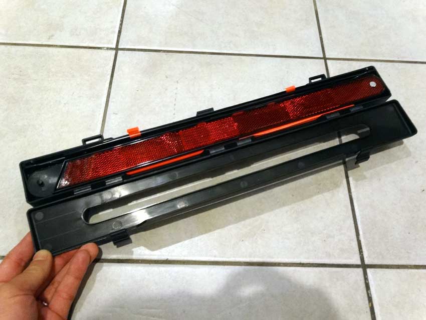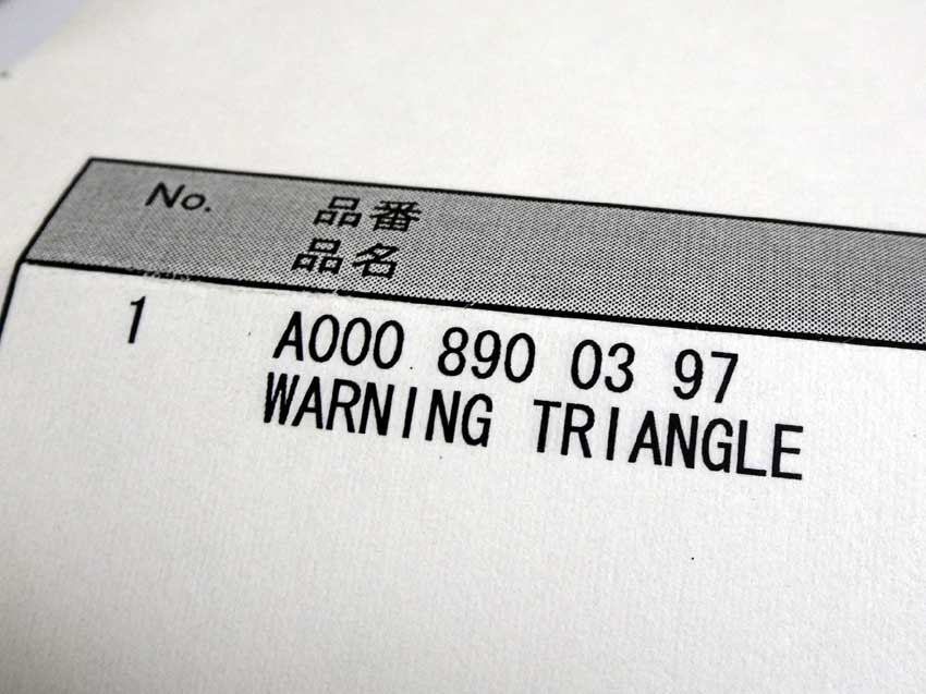 先日メルセデス・ベンツのディーラーへ新型Cクラスを見に行ったら、使えそうなネタがあったので部品を購入しました。 小型の三角停止板。 ケースにスリットが開いてて、反射板が見える仕組み。 裏側にはクリップ付き。 純正部品である証のメルセデス・ベンツのレリーフもあります。 ケースを開けると本体が見えます。 ちなみに組み立てた表示板。 ストロボで撮影するとしっかり光ります。 バックドアトリムに小さい穴をあけ、クリップを外したケースをタイラップで固定。 スペースの効率化ができました。 使用者の目線で。 蓋を開けても落ちて来ません。良く考えられてるな~。 ちなみに取り寄せた品番と品名。価格は7000円弱。 ちょっと高かったけど機能性&見た目が良くなったので満足度高し。 オススメです。