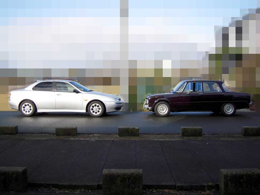 そんな箱男さんの156は国内では珍しい15インチ。タイヤは205/60R15のBSのスニーカー。 おそらくコレが一番効いていると思い「年末年始に試着させて!」とお願いしたらOKをもらったので、今日の早朝から交換作業してきました。 156のプチオフだぜー(笑。 先日購入したガレージジャッキを使ってみたけど、正直イマイチでした。各部の遊びが多いせいか、細かいレバー操作では全然上がらない・・・。結局サポート役のシザーズジャッキが活躍することになりました(泣。 気を取り直して交換作業開始~と思い、箱男さんのホイールボルトを緩めようと手でクロスレンチに力をかけてもびくともしない。 次の手段としてクロスレンチに乗っかって見るも手応えなし・・・。 再度手に体重をかけて「ふぬぅぅぅ~!」と力を入れたら、手首を痛めました(ToT) 仕方が無いので持参したウマの頭をレンチにかぶせて、エクステンション代わりにしたら緩んだけど、どう見てもインパクトで締め上げたっぽい。 コレだから○○゙○石油は・・・。 交換中にジュリア乗りのA君が来てお手伝いをしてくれて無事終了ー。 ◆ビフォー ◆アフター いやぁ、力が抜けた感じでいいじゃないですか!雰囲気が本国仕様に近づきましたよ。 早速試乗したところ、クルマが軽快かつしっとりしましたよ。この組み合わせはアリだなぁ。ボディとアシ周りのバランスが取れて、運転していてすごく気持ちイイ。 さらにステアリングを切り込んだ時のフィーリングが、タイヤがたわんでから曲がり始めるようになったので、良い意味で「間(タイムラグ)」ができました。 これぞアルファ!ビバ!インチダウン&60タイヤ!! 正直、今までの中立付近のステアフィールは敏感過ぎて好みではなかったんですが、きっとコレが本来の156の味付けなんじゃないかなぁ。 日本での156のイメージはスポーティーセダンだけど、イタリアでは普通の実用セダンですからね。日本仕様は見た目を重視した戦略で売り出したんだろうけど、機械としてはイマイチだと思います。あぁ、勿体無い。 ご先祖様とツーショット 箱男さん、A君有難うございました! 作業が終わり走っているとカッコイイロードスターが止まっているあぶらやサンがあったので、立ち寄ってみました。 お客さんのかなーと思ったら、お店のヒトのでした(棒読み)。 「車洗いたいんですよー」とお話しすると「ポリマーコーティングできますヨ」とオススメされたのでお願いしました。どうやらこのあぶらやサンは磨きのテクニックに自信があるようです。 4月にうえしまサンがやってくれたクリスタルキーパーのお陰で、表面に付着した汚れの層を削るだけで良いそうです。 あっという間に作業は完了し、ツヤのおかしなクルマの出来上がり(笑 スッゲー!ヌメピカ!! 磨き職人さんとしばし談笑し楽しいひと時を過ごせました。有難うございました!! ◆オマケ 秀逸! PR